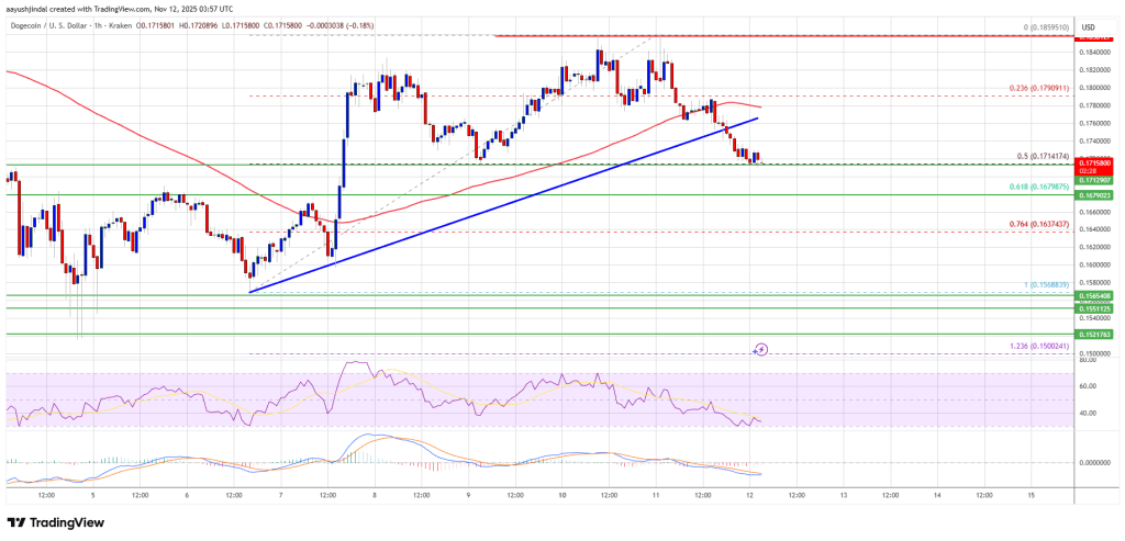 DOGE 价格开始新一轮下跌,跌破 0.180 美元。