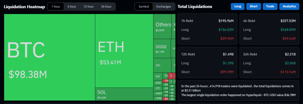 报告显示,超过39万个账户被盗。被彻底消灭价格波动期间,Hyperliquid 平台上一笔高达 3700 万美元的 BTCUSD 单笔订单格外引人注目,这表明抛售异常激烈。比特币首当其冲:24 小时内约有 9.62 亿美元的比特币仓位被抹去,其中多头头寸就占了近 9.31 亿美元。这些数据凸显了押注价格上涨的投资者所遭受的损失有多么集中。